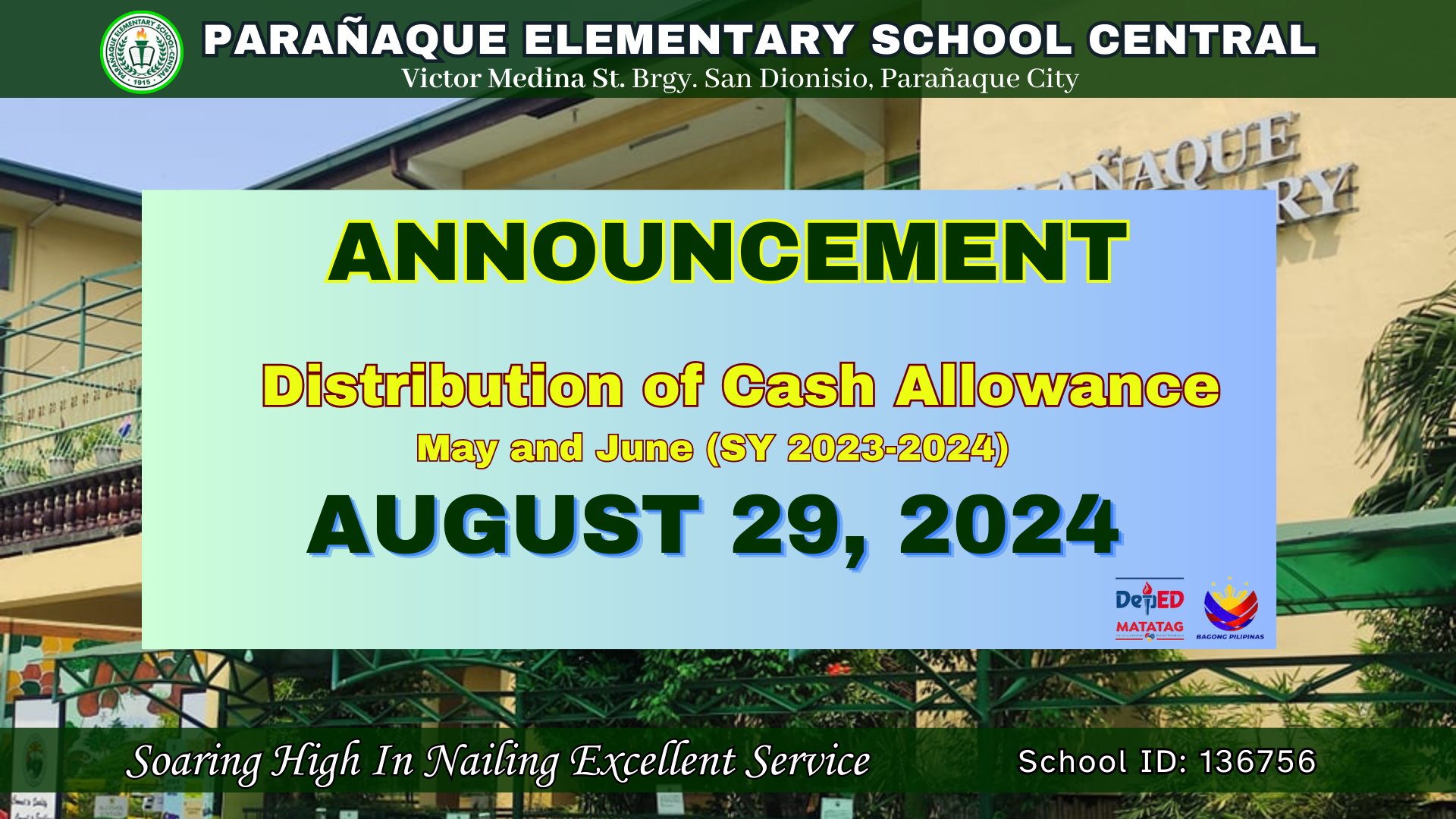 𝐌𝐀𝐇𝐀𝐋𝐀𝐆𝐀𝐍𝐆 𝐀𝐍𝐔𝐍𝐒𝐘𝐎 | Ang lokal na pamahalaan ng Parañaque ay magpapatuloy sa pagbibigay ng monthly allowance sa mga estudyante ng Parañaque Elementary School Central para sa mga buwan ng Mayo at Hunyo 2024. Ang pamamahagi ay gaganapin bukas, Agosto 29, 2024, alas-12:00 ng tanghali. Para sa mga estudyanteng mula SNED hanggang Grade 5 na hindi continue reading : Distribution of Cash Allowance